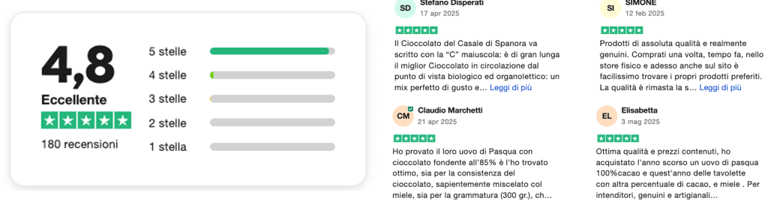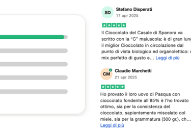 I recensori hanno avuto un'esperienza straordinariamente positiva con questa azienda. I clienti sono particolarmente soddisfatti della qualità dei prodotti offerti, sottolineando la loro genuinità e l'eccellenza delle materie prime utilizzate. Molti apprezzano l'ampia varietà di cioccolati, tra cui il fondente e quello Ruby, evidenziando il gusto unico e la lavorazione artigianale. Inoltre, il servizio di consegna è considerato impeccabile, con spedizioni rapide e imballaggi accurati che proteggono i prodotti durante il trasporto. L'azienda viene descritta come seria e attenta alle esigenze dei clienti, pronta a risolvere eventuali problemi e a offrire un'assistenza cordiale e disponibile. I consumatori lodano anche il rapporto qualità-prezzo, ritenendolo adeguato alla produzione artigianale e alla bontà dei prodotti.